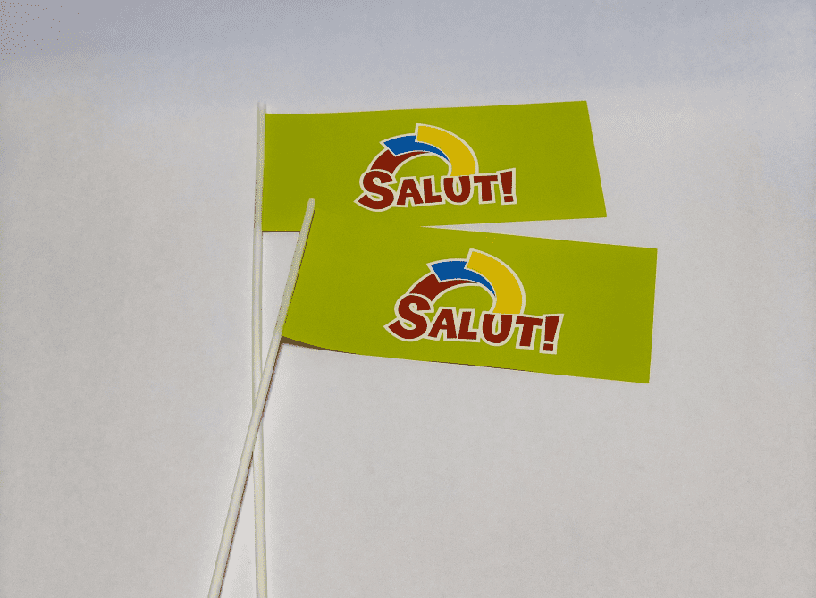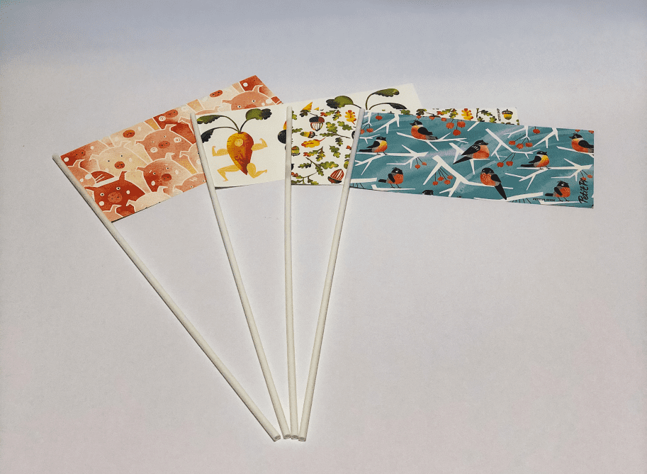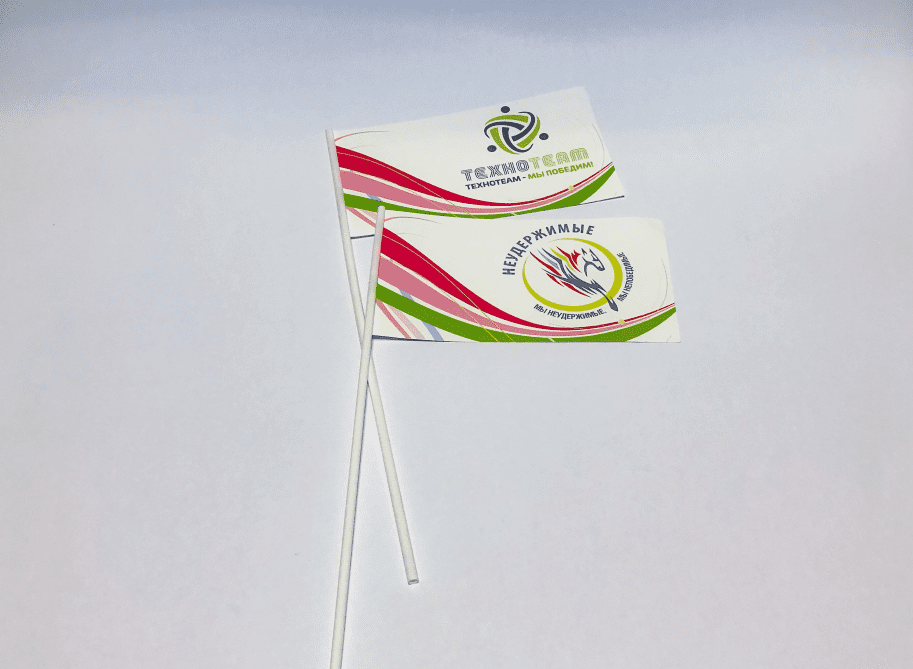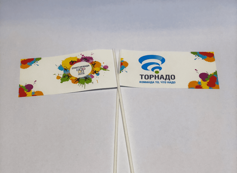 Флажки бумажные состоят из прямоугольного листа размером 210*100 мм и белой трубочки длиной 37 см. Как правило, такие портативные носители содержат следующую информацию: название, логотип и иногда слоган компании или бренда. Печать изображения может быть одно- или двусторонней. Все эти детали можно обсудить как лично, так и если оформить онлайн заказ на изготовление бумажных флажков.